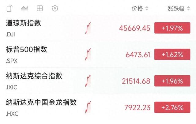 盘面上,美股三大股指早盘大幅拉升,截至发稿,道指、纳指涨近2%,标普500指数涨超1.5%,纳斯达克中国金龙指数涨超2.5%。
